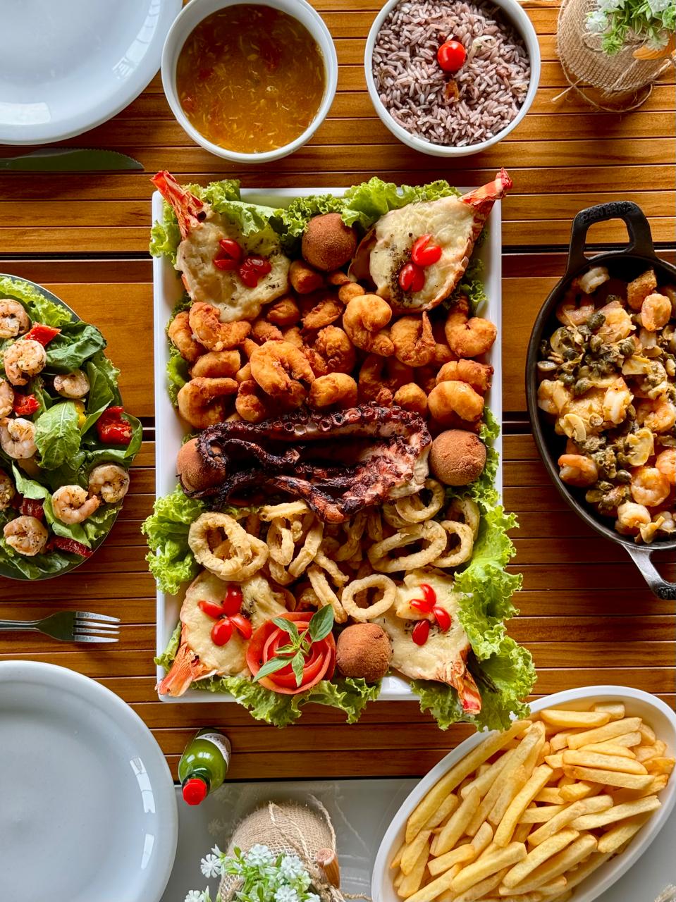 Lagosta ao Thermidor, polvo na brasa, camarão à milanesa, bolinho de sirí e filés de garoupa grelhada com camarões salteados com champignon e alcaparras, e lula à dorê. (Sob consulta)